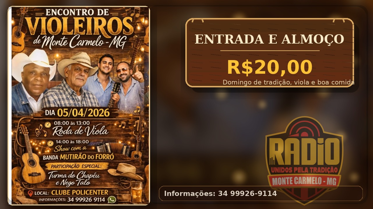Monte Carmelo já se prepara para viver mais um grande momento de valorização da cultura popular com a realização do Encontro de Violeiros de Monte Carmelo - MG, marcado para o dia 05 de abril de 2026, no Clube Policenter. O evento reúne a força da música sertaneja de raiz, o encontro entre violeiros e o clima de confraternização que marca esse tipo de celebração tradicional.